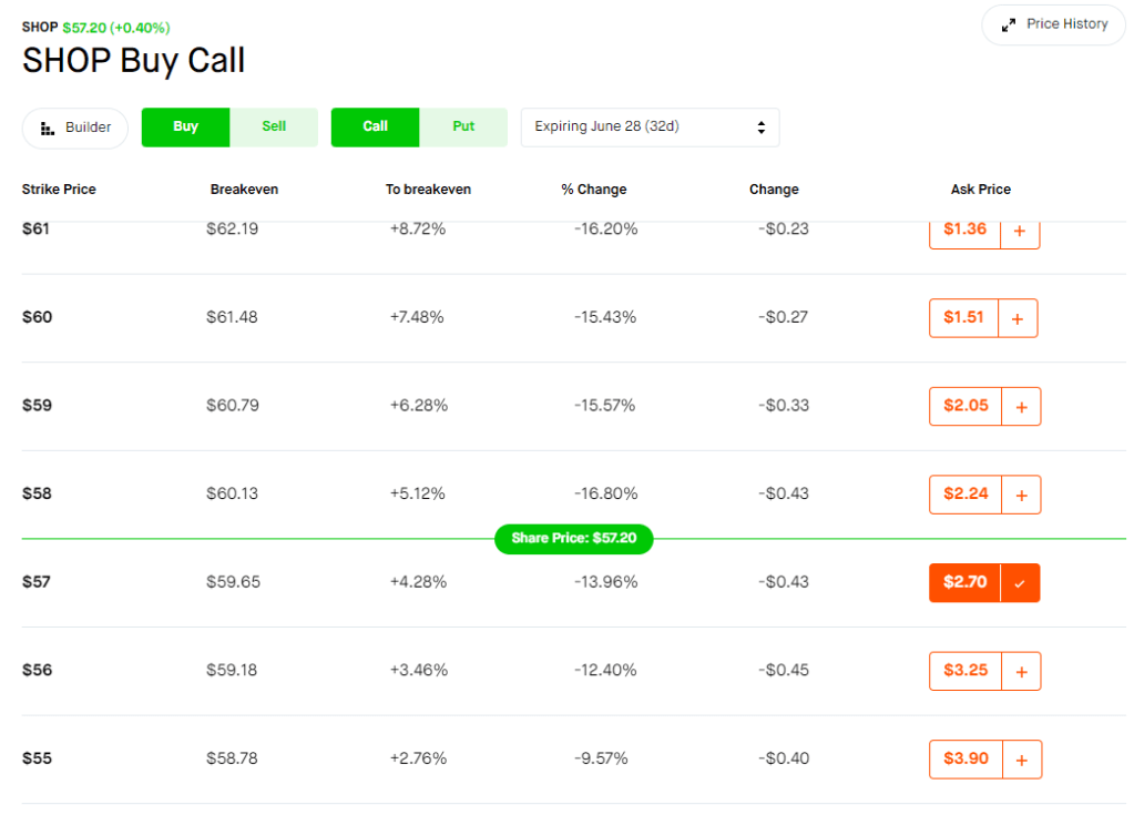 That means, if Shopify’s stock price rises above $59.70 per share, it would become worth it to exercise the option for your right to buy 100 shares at $57/share.